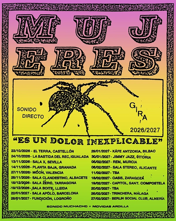 El próximo viernes, 20 de marzo, se pone a la venta 'Es un dolor inexplicable', el nuevo disco de Mujeres, banda que en las últimas semanas nos ha presentado adelantos como el reciente “Caen imperios”, "Alucinante" o "Después destello". La presentación en directo de este séptimo disco del trío ya cuenta con una nutrida gira que comenzará el próximo 23 de octubre en El Terra de Castellón y que se prolonga actualmente hasta el 27 de febrero de 2027 en el Berlín Social Club de Almería.