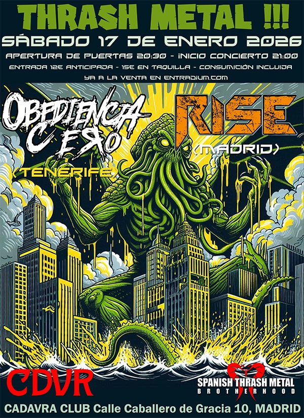 El thrash metal de los tinerfeños Obediencia Cero, que el pasado verano nos presentaban su nuevo material, ‘Mundo caos’, en esta entrevista, tomará al asalto la península el próximo sábado, 17 de enero, con el concierto que se celebrará en el Cadavra Club de Madrid.