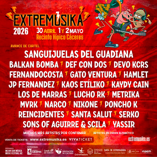 El festival Extremúsika, considerado uno de los “motores culturales de Extremadura”, ha anunciado 21 nuevos artistas que se suman a los ya confirmados Sanguijuelas del Guadiana para su edición de 2026. Por lo tanto, hasta el momento, estos son todos los artistas que se subirán a su escenario: Def Con